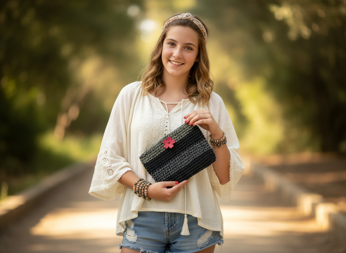 Discover the timeless elegance of our Black Cotton Crochet Pouch with Flower Button, a handcrafted essential that blends artisan tradition with everyday functionality. Measuring 14 cm x 20 cm, this versatile pouch is thoughtfully designed to hold your daily essentials—cards, cash, keys, or small treasures—while adding a touch of bohemian charm to your routine.