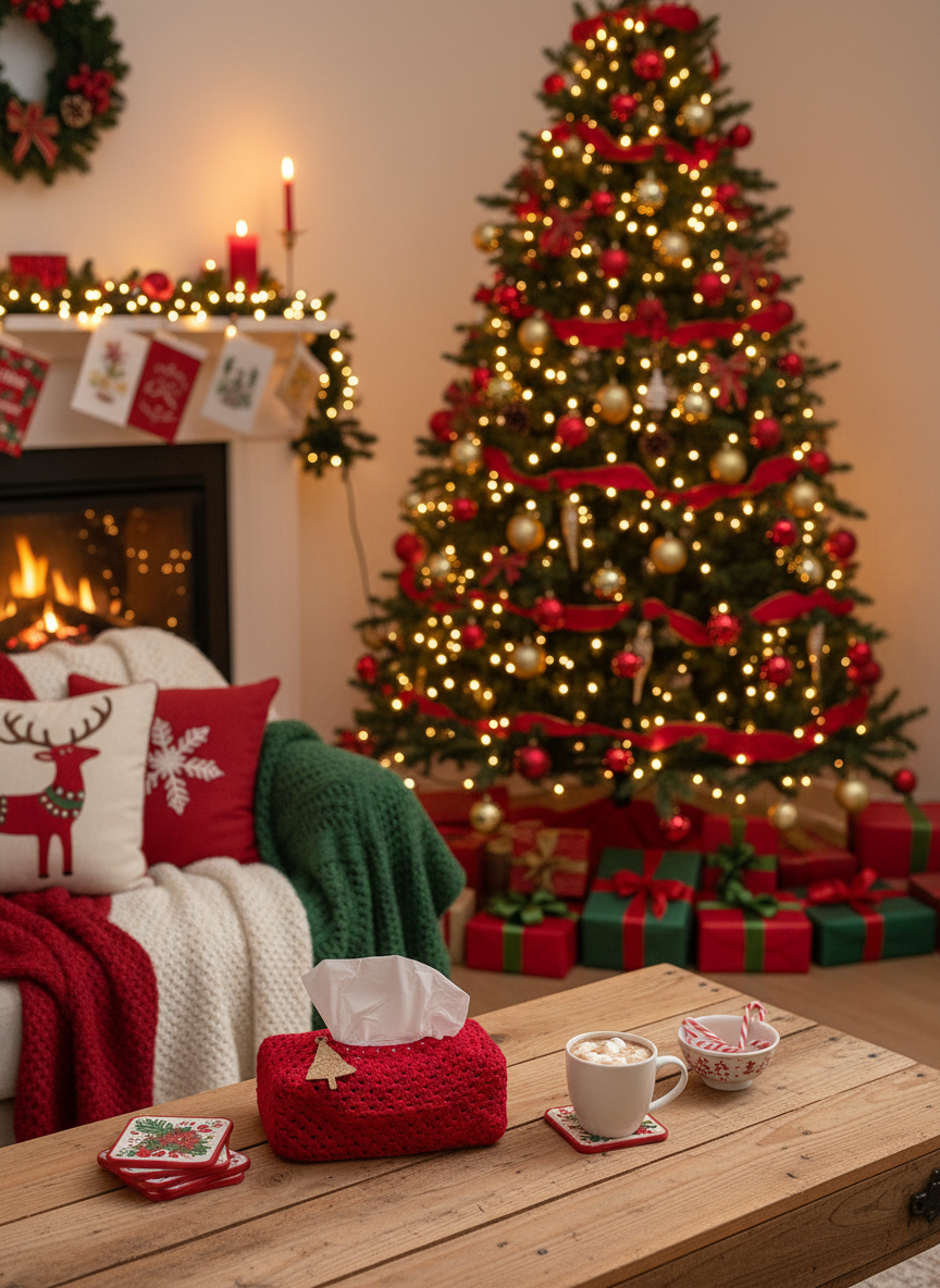 The bronze-colored Christmas tree motif adds a sophisticated seasonal touch that complements both traditional and modern holiday décor. This handcrafted cover transforms an everyday essential into a charming festive accent that enhances your holiday atmosphere.
