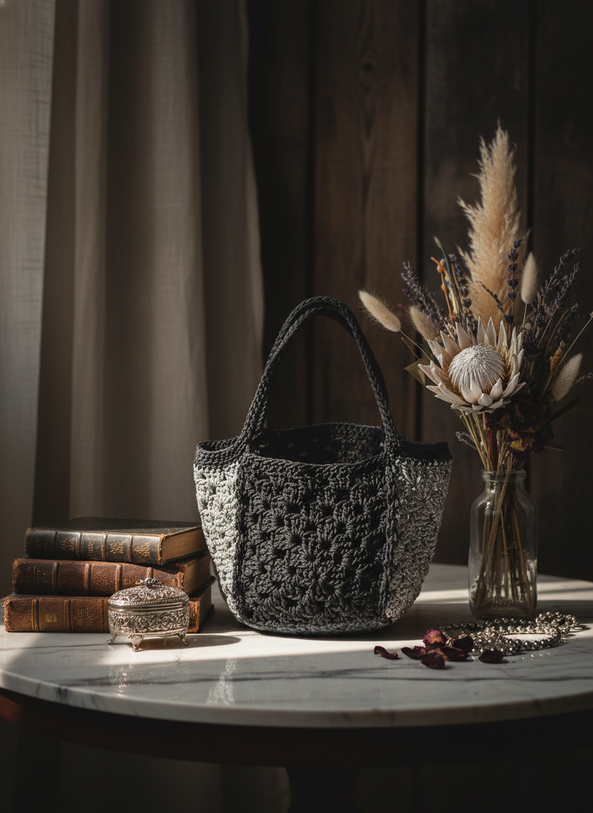 This sophisticated handmade bag showcases the classic beauty of traditional granny square crochet in an elegant black and silver color palette. Each square is meticulously hand-crocheted and expertly joined to create a stunning accessory that perfectly balances vintage charm with contemporary style.
