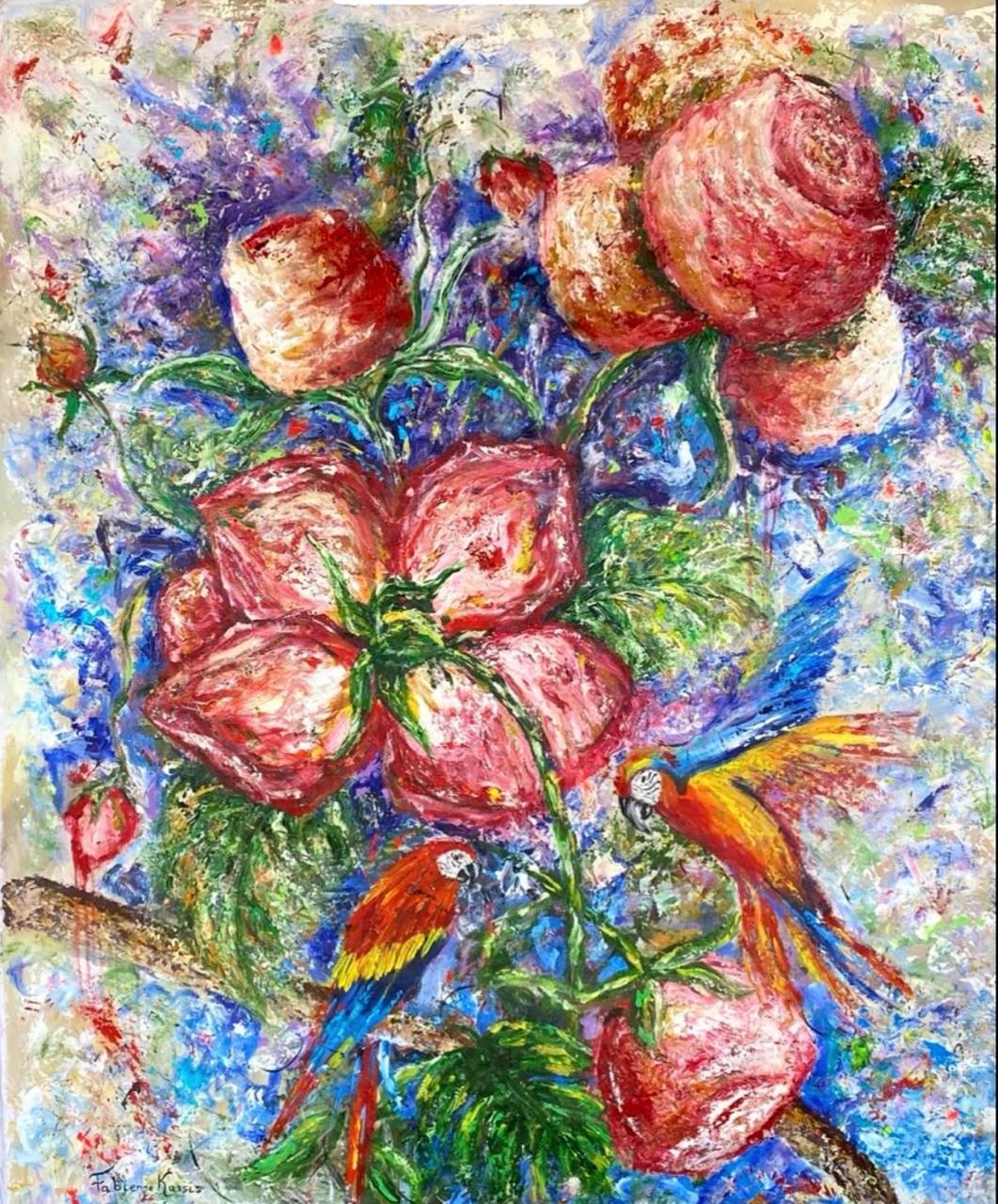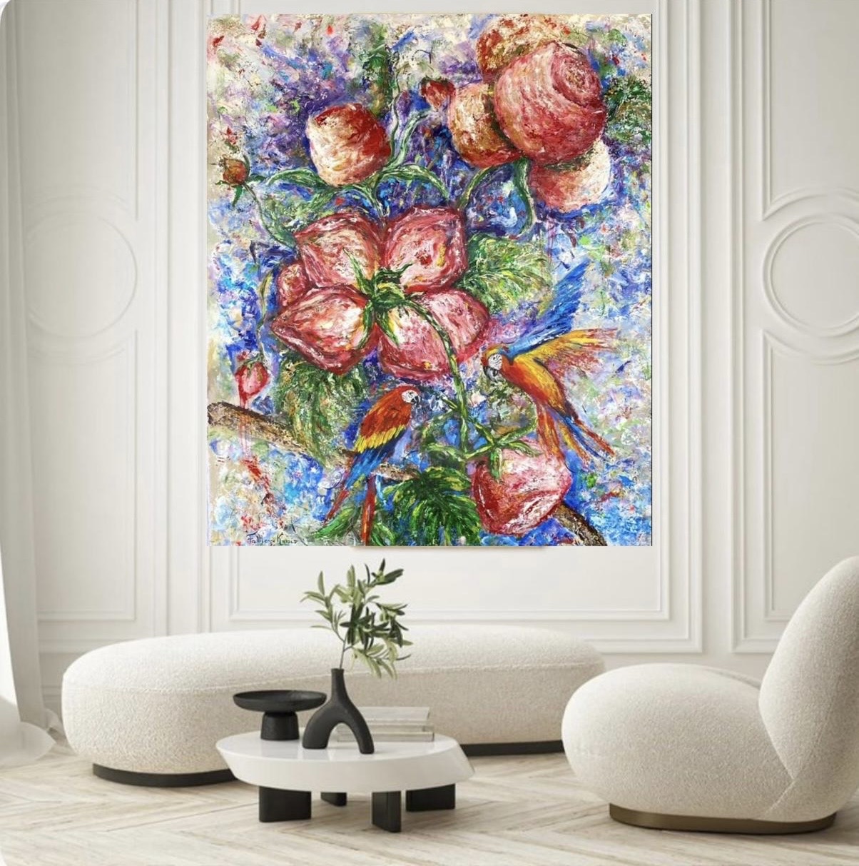 A vibrant and expressive contemporary painting that captures the delicate beauty of blooming flowers intertwined with lively, colorful birds. “Her Sweet Perfume” blends rich textures, layered brushstrokes, and a harmonious palette of pinks, greens, blues, and warm tones to evoke the freshness of nature and the elegance of floral movement. The artwork’s grand scale and intricate detailing make it a striking statement piece for any refined interior.